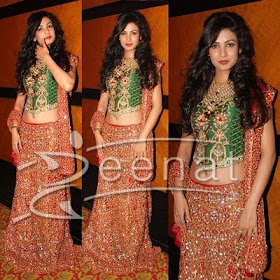 Its a designer Lehenga Choli in purple and orange shades. With Square embroidered Choli and heavily embellished Lehenga in many shades. Her dupatta is also having boti sequin work along borders, Sameera paired it with heavy matching designer jewelry. Over all she looks awesome in Bridal Lehenga.