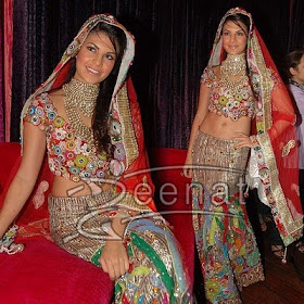 Jacqueline embellishes herself in this classic yet stylish Designer Lehenga Choli. Multi colored choli adorned with colorful flowers all over. While the Lehenga is also very fascinating, shiny fabric is hidden behind the amazing embroidered work. Paired with a Red Net Base see through dupatta, with laced edges. Her Neck Jewelry adds a touch of glamour to Jacqueline.