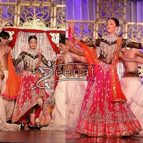 Wearing an outstanding Bridal Lehenga in Light Green with heavy silver embellishments The bottom flair is completely emboirdered moreover the matching dupatta looks great and fancy. Aishwarya is not wearing a typical Indian Choli but she's in full sleeves fitting top which is embellished through yoke, sleeves and closed neck.
