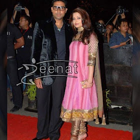 Beautiful Aishwarya Rai & Big B attending Shilpa Shetty's Reception at Grand Hyatt. Aishwarya was definitely a highlight at the party wearing Dark Pink Anarkali Churidar Style Salwar Kameez.Silver embroidery on yoke and sleeves. While their is so much flair adding glamour to her. The bottom is as usual plain matching Churidar.
